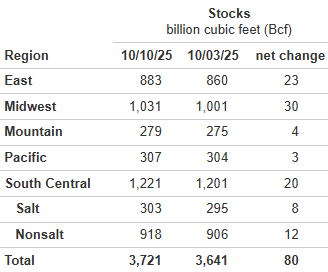 October 16: Today’s EIA report printed a build of +80 Bcf, in line with market expectations of +80 Bcf, while slightly smaller than the 5-year average of +83 Bcf. The build increased supplies to 3,721 Bcf, while decreasing surpluses to +154 Bcf. Also of importance, supplies are 26 Bcf higher than this time last year.