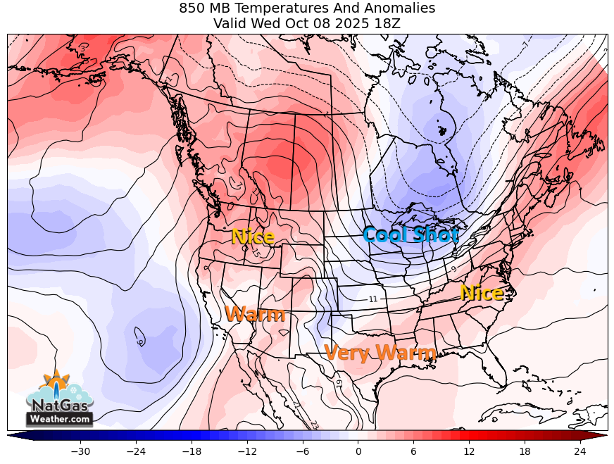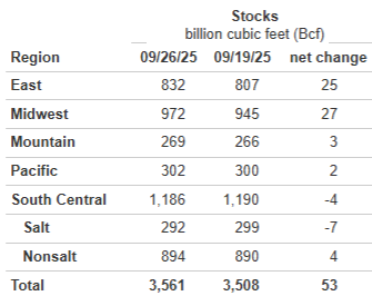 October 2: Today’s EIA report printed a build of +53 Bcf, much lighter than market expectations of +65 Bcf. The build increased supplies to 3,561 Bcf, while decreasing surpluses to +171 Bcf. Also of importance, supplies are 21 Bcf higher than this time last year.