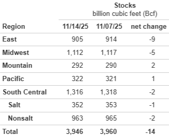November 20: Today’s EIA report printed a draw of -14 Bcf, in line with market expectations, while also more demand used compared to the 5-year average of +12 Bcf. The draw decreased supplies from 3,960 Bcf to 3,946, while decreasing surpluses from +172 Bcf to +146 Bcf. Also of importance, supplies are 23 Bcf less than this time last year.