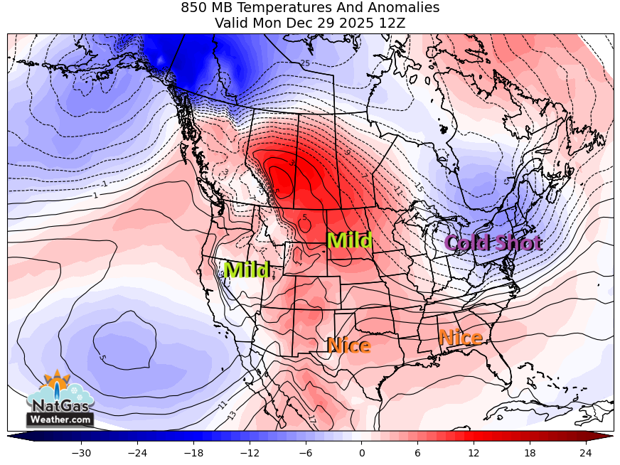 Monday: The weekend weather data trended colder, especially Dec 29-31 and where more than 15 HDDs were added for these days. It wasn’t a surprise the weekend weather data added demand since it was the warmest of the past 50-years for that period going into the weekend. But the pattern is still much too warm the next 7-days and also for Jan 1-5 and that led to selling and sharply lower prices.