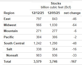 December 18: Today’s EIA report printed a draw of -167 Bcf, slightly smaller than market expectations, although decently larger than the 5-year average of -96 Bcf. The draw decreased supplies from 3,746 Bcf to 3,579, while increasing surpluses to +32 Bcf. Also of importance, supplies are 61 Bcf less than this time last year.