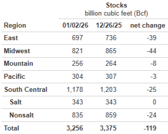 January 8: Today’s EIA report printed a draw of -119 Bcf, in line with market expectations. The draw decreased supplies from 3,375 Bcf to 3,256, along with surpluses of +31 Bcf. Also of importance, supplies are 123 Bcf less than this time last year.