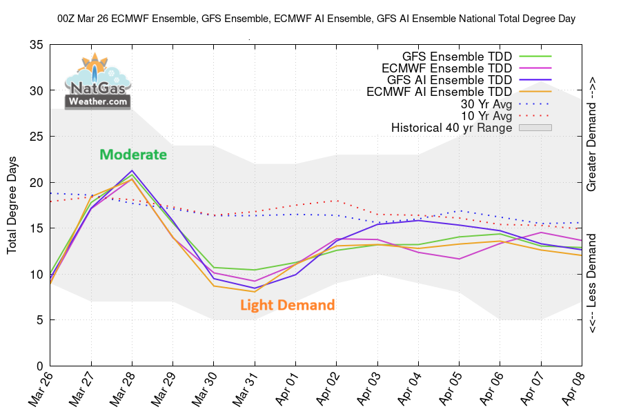 Thursday: National demand will be light today and Thursday, then stronger Friday through Sunday as a chilly weather system tracks across the Midwest and Northeast. Demand eases back to light next week as much of the US warms to near or above normal. The graph is from our Live HDD/CDD data and shows the major weather models daily forecast TDD totals and versus normal.