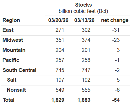 March 26: Today’s EIA report printed a draw of -54 Bcf, larger than market expectations, while modestly larger than the 5-year average draw of -21 Bcf. The draw decreased supplies from 1,883 Bcf to 1,829 Bcf. The draw decreased surpluses of +47 Bcf to +14 Bcf. Also of importance, supplies are 90 Bcf higher than this time last year.