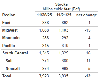 December 4: Today’s EIA report printed a draw of -12 Bcf, smaller than market expectations of -15 Bcf, while decently lighter than the 5-year average of -43 Bcf. The draw decreased supplies from 3,935 Bcf to 3,923, while increasing surpluses from +160 Bcf to +191 Bcf. Also of importance, supplies are 18 Bcf less than this time last y