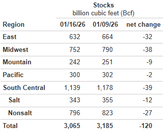 January 22: Today’s EIA report printed a draw of -120 Bcf, larger than market expectations around -105 Bcf. The draw decreased supplies from 3,185 Bcf to 3,065 along with surpluses increasing to +177 Bcf. Also of importance, supplies are 141 Bcf greater than this time last year. But with a frigid pattern about to play out surpluses are expected to flip to deficits by the end of the month.